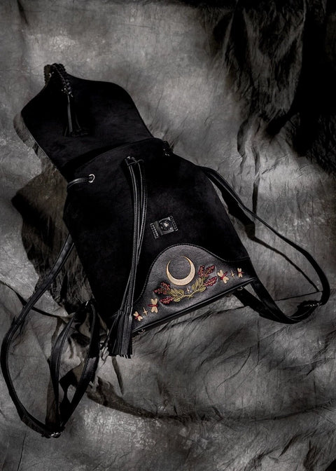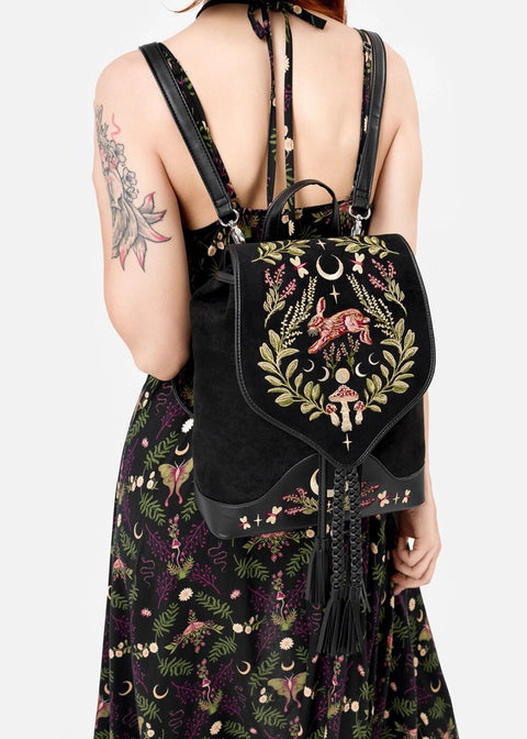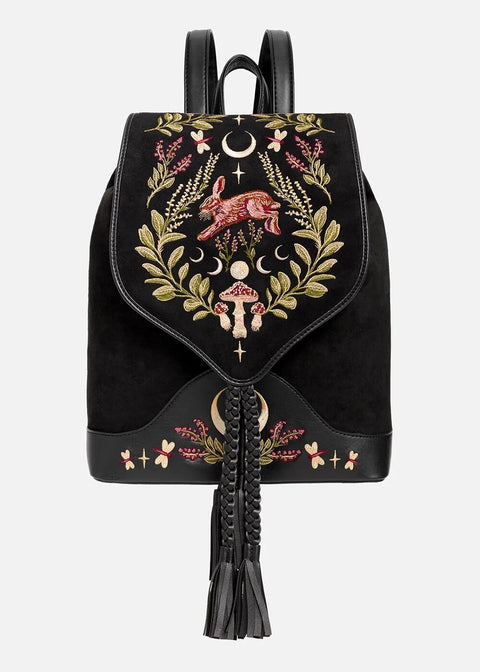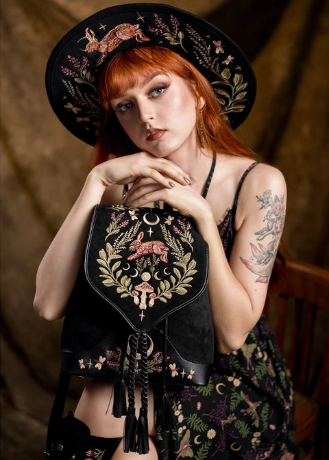 Por supuesto, en pleno estilo Cottage Core con la mochila Hare Moon, que te dejará sin aliento con su negro ante sintético y sus bordados místicos de plantas y ese conejito... También es práctica (al igual que tu magia), ya que es lo suficientemente grande para todas tus necesidades diarias (o nocturnas). Así, siempre tendrás tus vibras de bruja cerca de ti ♥