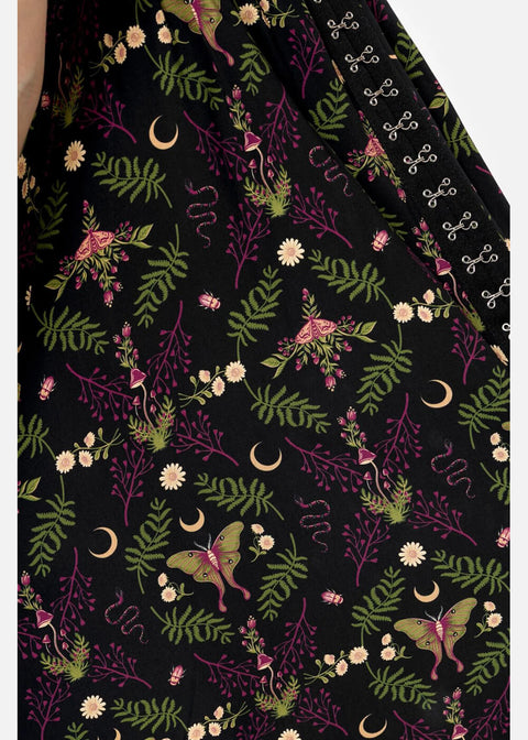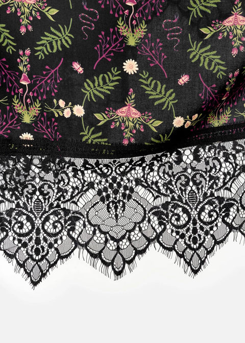 ¿Cómo describirías tu estilo de vestir? Si "predominantemente negro y un estampado de Naturaleza Hechicera del que no puedo prescindir" se aproxima a tu respuesta, la colección Wilderwood es ideal para ti. Con un estampado mágico lleno de polillas, helechos y medias lunas, junto a detalles sensuales de encaje, solo hay una pregunta: ¿cómo puedes vivir sin esta preciosidad?