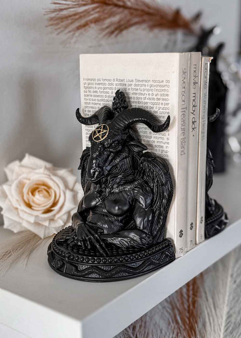 Deze zwarte boekensteunen zijn prachtig vormgegeven in de iconische Baphomet-stijl, perfect voor elke sinistere bibliotheek. Gemaakt van zwart hars, brengen ze een duistere sfeer en voegen ze een artistiek element toe aan je interieur. Maak jouw boekenverzameling compleet met deze ultieme statement pieces!