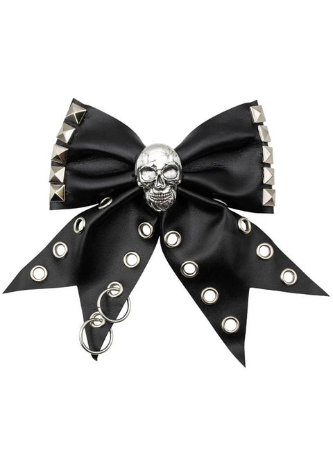Lazo de pelo negro de Kreepsville con calavera y tachuelas metálicas, ideal para un look punk o gótico.