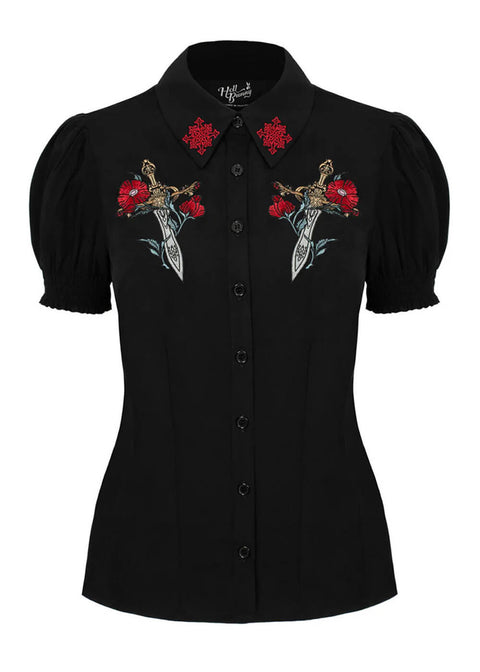 Op het eerste gezicht een elegante zwarte blouse… tot je de borduursels ziet! De Elyse Blouse is ideaal voor kantoor tot concert: elegant en een tikje gevaarlijk met haar statement borduursels van zwaarden en bloemen. Perfect voor retro romantiek met een dark edge 🗡️