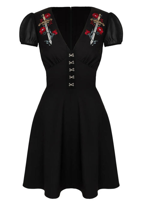 Negro, coqueta y con un toque de peligro - ¡Elyse es para ti! Esta belleza combina un clásico fit & flare con bordados llamativos de espadas y flores. Perfecta para el romance retro con un toque oscuro 🗡️