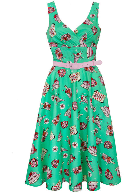 Sobre un fondo verde-azulado fresco, helados, porciones de tarta, cupcakes y fresas se mezclan alegremente con pequeñas chispas, como si acabaras de salir de un diner estadounidense. El corte retro presenta un bonito escote en V con tirantes anchos y una falda con vuelo que se mueve desde el primer paso. El cinturón rosa pálido añade la guinda del pastel: ¿te apetece algo dulce?